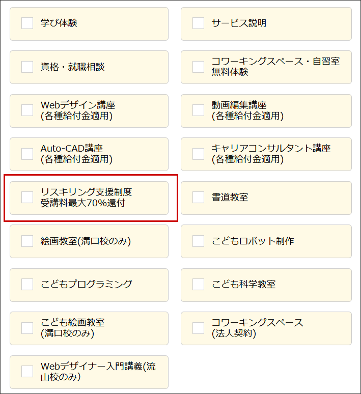 「説明会ご予約フォーム」より、ご希望の校舎、日程を選択し、「リスキリング支援制度 受講料最大70%還付」を選択の上、お申し込みください。